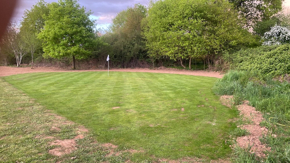 The whole idea stemmed from a light hearted conversation having viewed the house and gites back in 2024. There was a whole meadow and it just seemed like a waste of space, a comment was made about golf and before you know it ideas are racing through your head. Initial ideas on layout would have seen the green in one of the corners but having really looked at it plans altered and I now think we picked the right place. Framed beautifully by oak trees the green offers a real test from two of the tees but is still playable by non golfers from the other one.