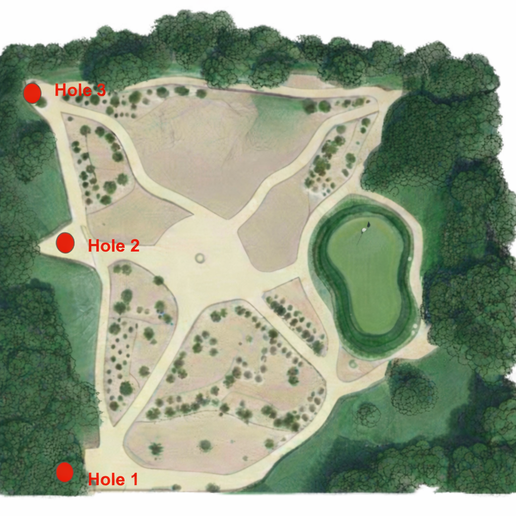 Hole 3 – Le Petit Chene (The little oak), named after the oak sapling that is on the tee box area. The longest tee shot into the green, 90-95 yards across the meadow, a tough angle to the green – a real test